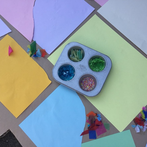 The set up was simple. We used a recycled flat cardboard piece with sheets of paper and confetti stuck onto the board to create interest and inspiration. We also added rice and other open ended pieces to the mix for the children to engage with their senses with various textures. We wanted to encourage the children to use their words to describe what they were sensing and viewing. We found that simple invitations to create are the best. We simply allowed the children to experiment with the elements and use these in their own way.