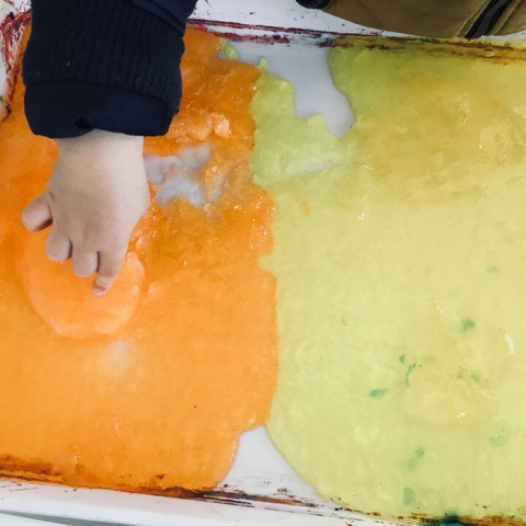 Here we explored our sense of touch and sense of taste. We talked about all the wonderful describing words of how the jelly felt in our hands - squishy, sticky, slippery, slimey, sloppy and smooth. We joked about how it would feel to have a bath in a tub full of jelly.